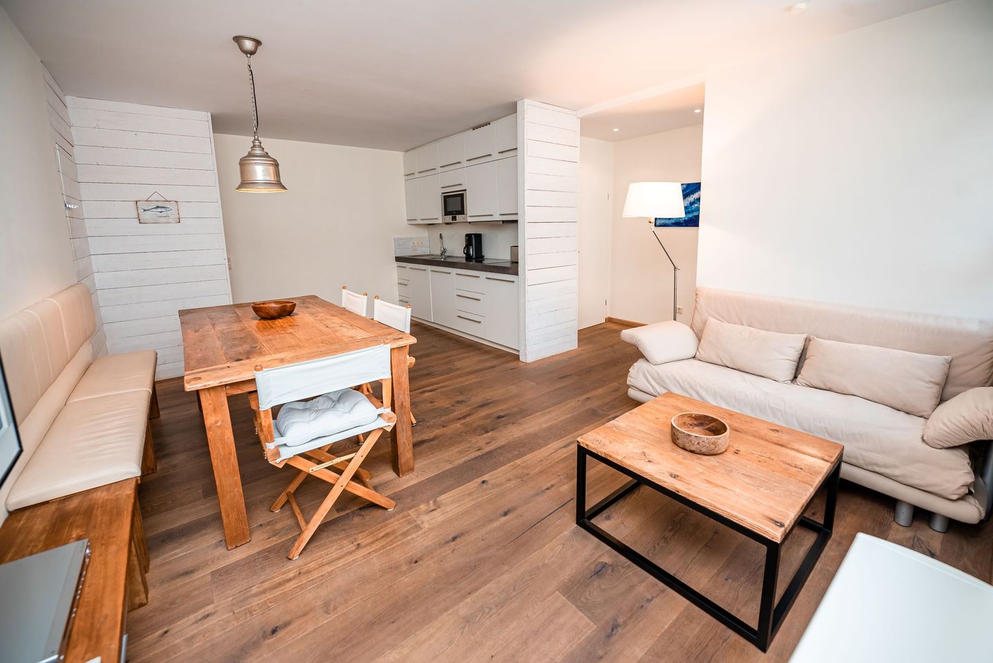 Die weiß getünchte Wandvertäfelung und die grauen großformatigen Fliesen repräsentieren die ganze Eleganz dieser Ferienwohnung.